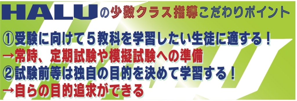 - 学校の進度に沿った授業を基本とし、定期テストで結果を出すことを第一の目標とします。